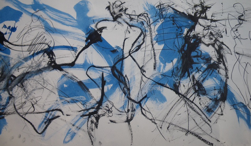 Studien, schnelle zeichnerische und malerische Prozesse in der Auseinandersetzung mit dem sich bewegenden Modell bilden die Basis vom realen Erfassen des Körpers bis zur Auflösung in abstrakte Bildkompositionen.